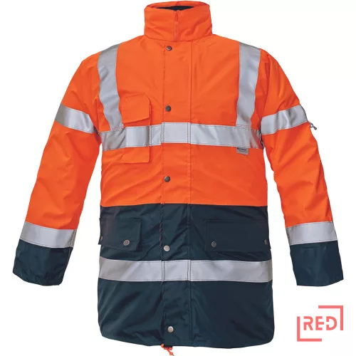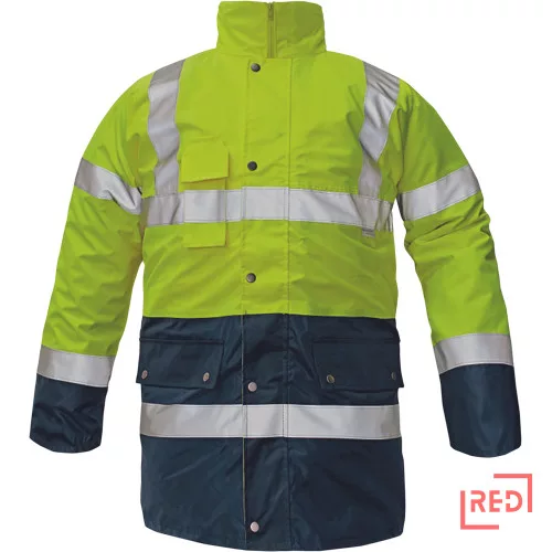 • bélelt jólláthatósági kabát 4 az egyben fényvisszavető csíkokkal • kivehető, külön is viselhető esőkabát, dzseki és mellény • gallérba hajtott kapucni • hegesztett varratok • vízálló • belső kötött mandzsetta