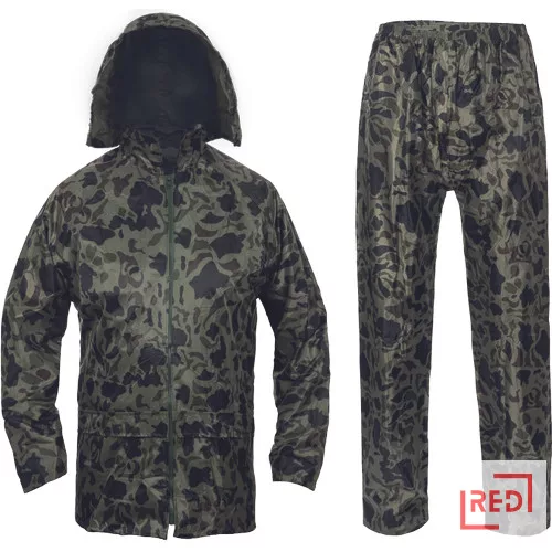 Kétrészes esővédő öltöny csuklyával, lehegesztett varratokkal, praktikus tartóban.