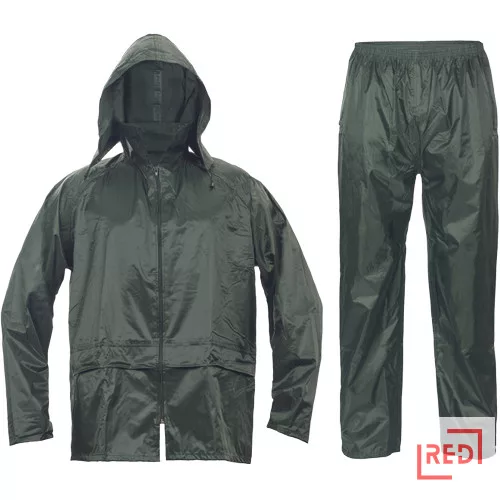 Kétrészes esővédő öltöny csuklyával, lehegesztett varratokkal, praktikus tartóban.