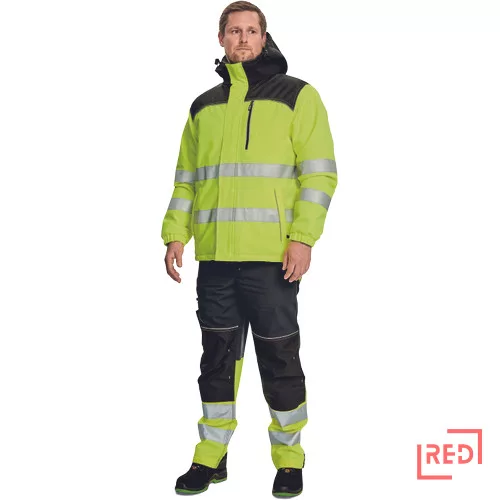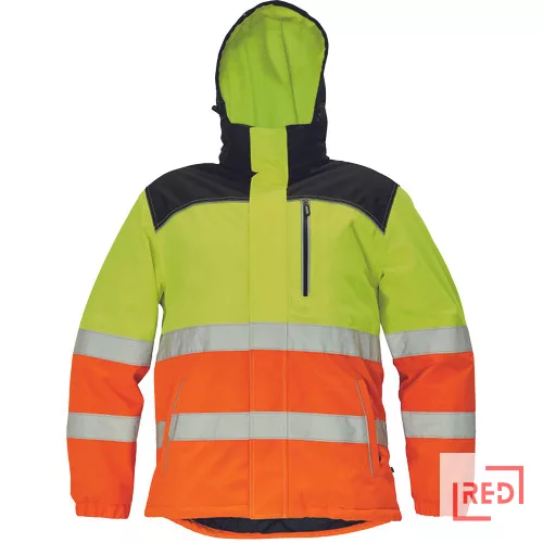 • bélelt jólláthatósági férfi télikabát levehető kapucnival • meghosszabbított hát- és vállrésszel • cipzáras, kontrasztos színű mellzsebbel • 2 oldalzsebbel • és 2 zárható belső zsebbel • A kabát alja húzózsinórral állítható • a vállrészen és a zsebeken fényvisszavető szegéllyel díszített • emblémázható