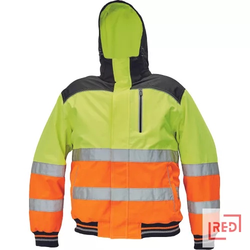 • férfi párnázott jólláthatósági pilótadzseki lecsatolható kapucnival • megerősített vállrész • cipzáras elütő színű mellzseb • 2 oldalzseb • zárható belsőzseb • a vállrészen és a zsebeken fényvisszavető szegély van • dekoratív varrás