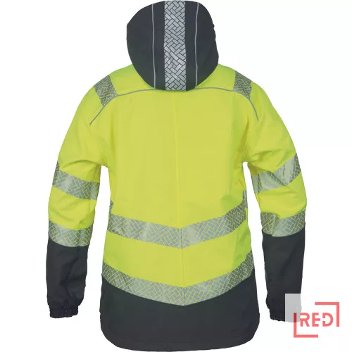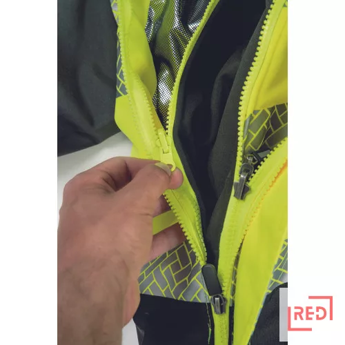 • férfi szél- és vízálló hi-vis kabát levehető kapucnival • a cipzárat tépőzáras hajtóka takarja • a kabát alja zsinórral szűkíthető • tépőzárral állítható mandzsetta • 2 cipzáras oldalzseb • 1 cipzáras mellzseb • 1 cipzáras belső zseb • hőszigetelő bélés • fényvisszavető szegély és szegmentált fényvisszavető csíkok