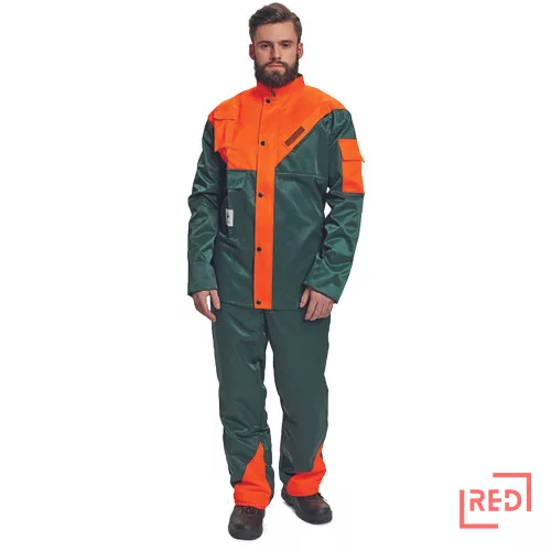 • férfi láncfűrészes kabát • rövid gallér polár béléssel • 1 cipzáras mellzseb • 1 zsebfedős telefonzseb • 1 karzseb • cipzárral záródó kialakítás patentos hajtókával • rugalmas belső mandzsettával • szellőző, bővítéssel ellátott hátrész