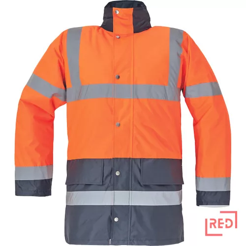 • jólláthatósági bélelt vízálló kabát fényvisszavető csíkokkal: EN 471: 3,2 • gallérba hajtott kapucnival, húzózsinórral • belső kötött mandzsetta • vízállóság 3. osztály és lélegzőképesség 1. osztály az EN 343 szabvány szerint