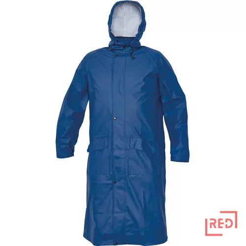 • víz-és szélálló, bő szabású esőköpeny gallérba hajtott kapucnival • hossza: 120 cm • húzózsinórral állítható kapucnival • 2 mély zsebfedős oldalzseb • patenttal szűkíthető mandzsetták