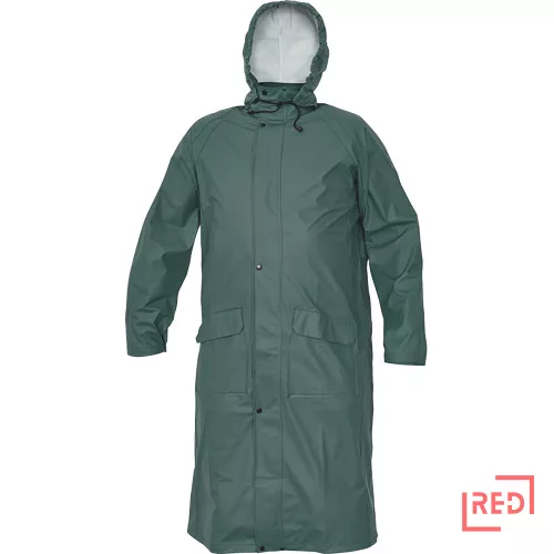 • víz-és szélálló, bő szabású esőköpeny gallérba hajtott kapucnival • hossza: 120 cm • húzózsinórral állítható kapucnival • 2 mély zsebfedős oldalzseb • patenttal szűkíthető mandzsetták