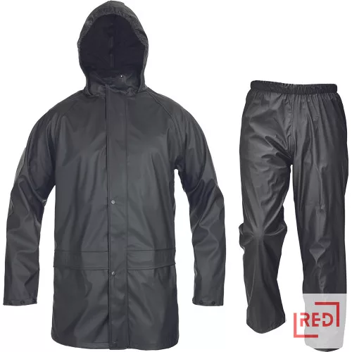 • víz- és szélálló esőöltöny • esőkabát gallérba hajtott kapucnival és rugalmas derekú nadrággal • puha poliészter szövet • 2 mély zsebfedős oldalzseb • patenttal szűkíthető mandzsetták
