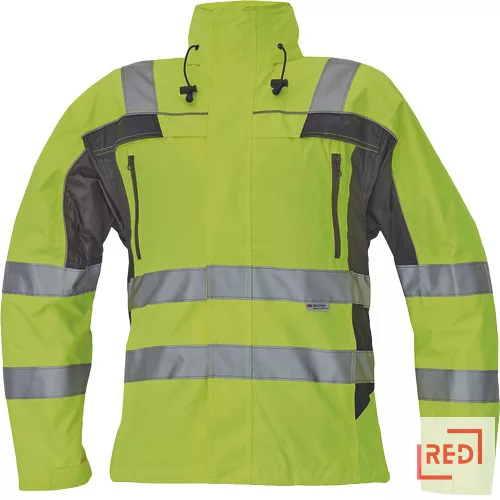 • bélés nélküli kabát jólláthatósági fényvisszavető csíkokkal: EN 471: 3,1 • gallérba hajtott, húzózsinórral állítható kapucnival • lehegesztett varratok, vízálló cipzárak • tépőzárral szűkíthető mandzsetták • húzózsinórral állítható alsó szegély • vízállóság 3. osztály és lélegző képesség 1. osztály az EN 343 szabvány